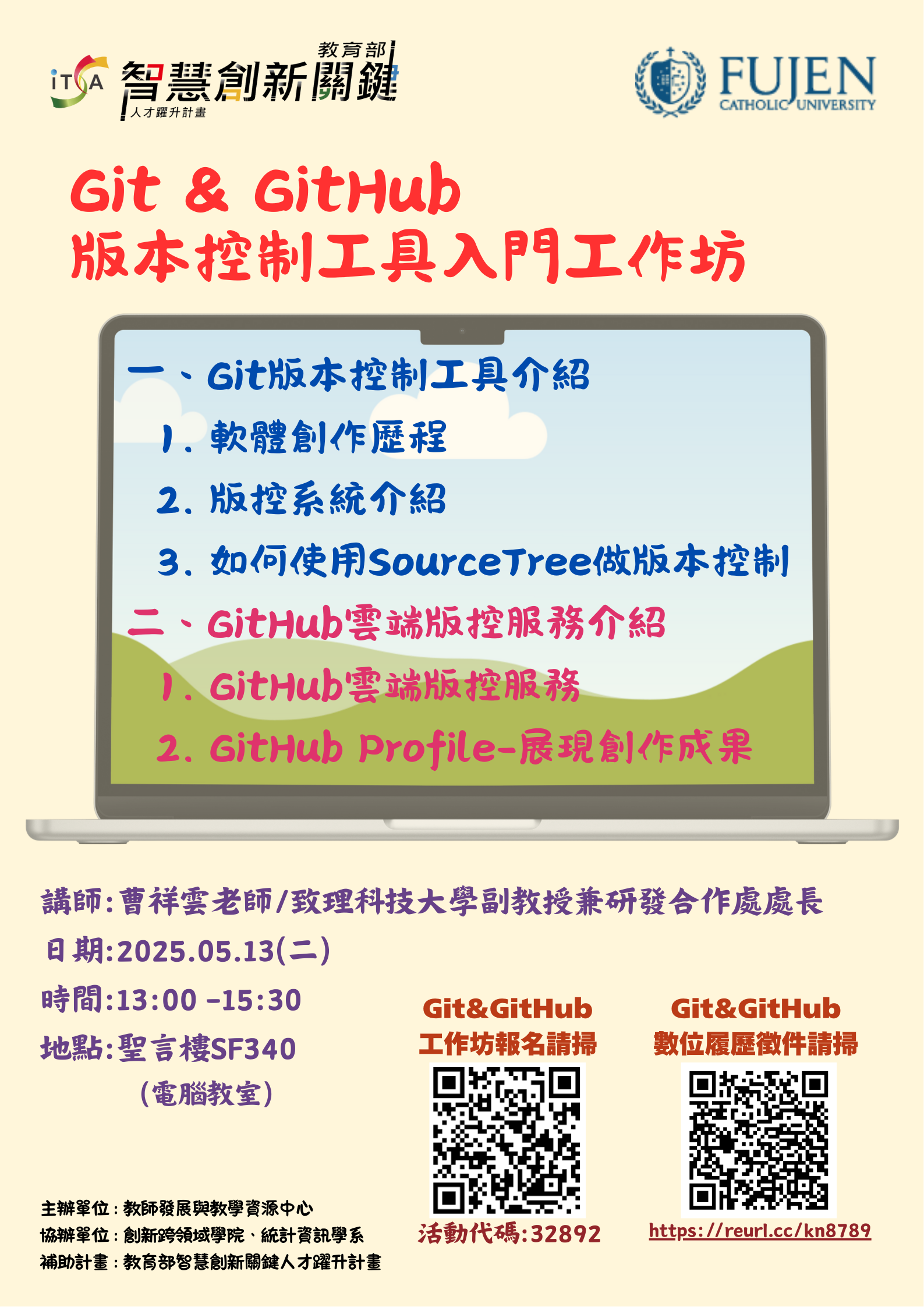 ⏰時間:114/05/16 (五) 10:30~13:00 (10:10開始簽到) 🎯地點:聖言樓SF337電腦教室 電腦教室不提供用餐,會後將提供餐點一份(素食者僅提供方便素),謝謝。 |