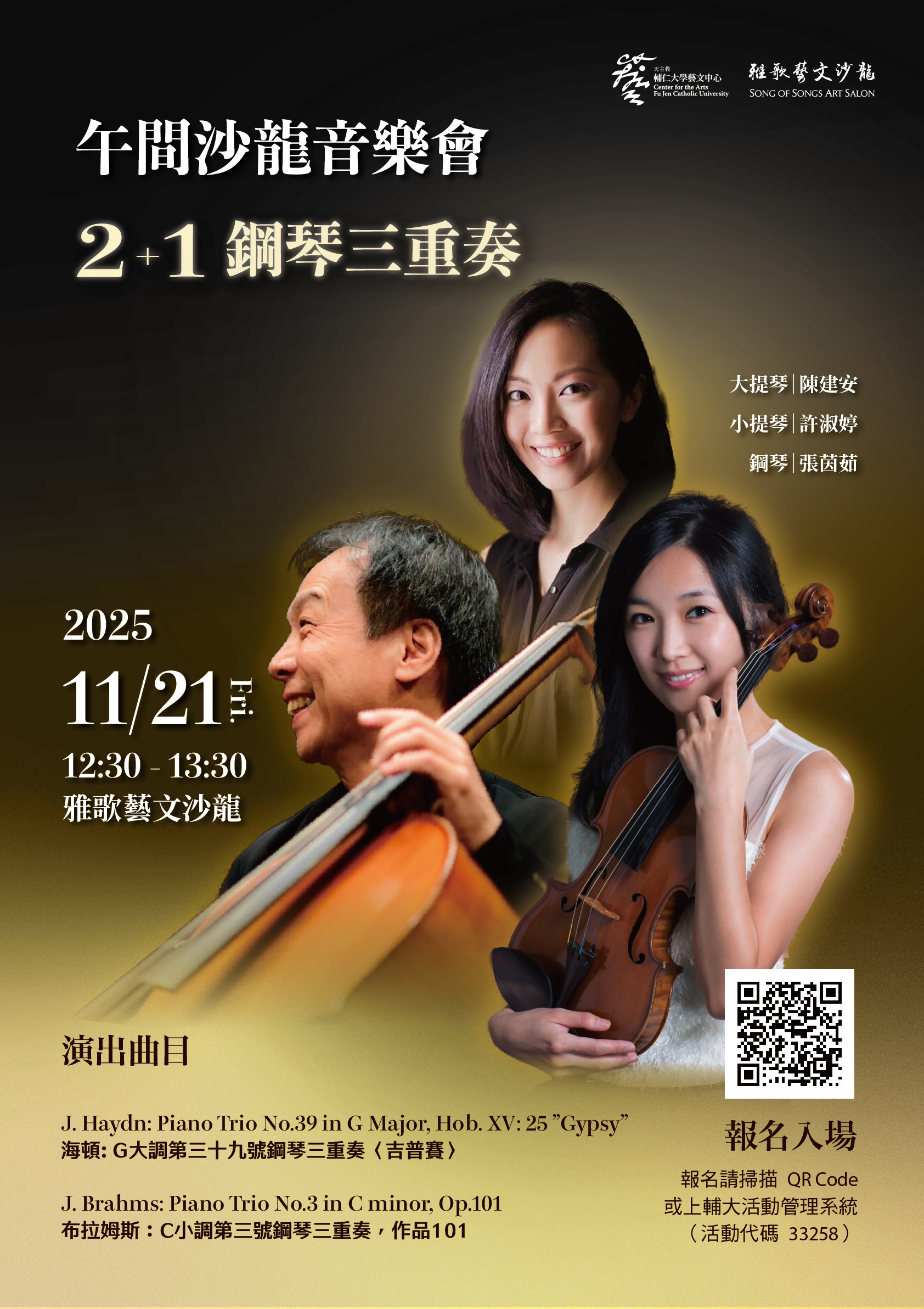 國內知名大提琴家陳建安老師率領「2+1 鋼琴三重奏」團隊,為輔大教職員工生帶來一場美好的古典音樂饗宴,曲目包括海頓以及布拉姆斯的鋼琴三重奏作品,歡迎大家蒞臨雅歌藝文沙龍共襄盛舉。