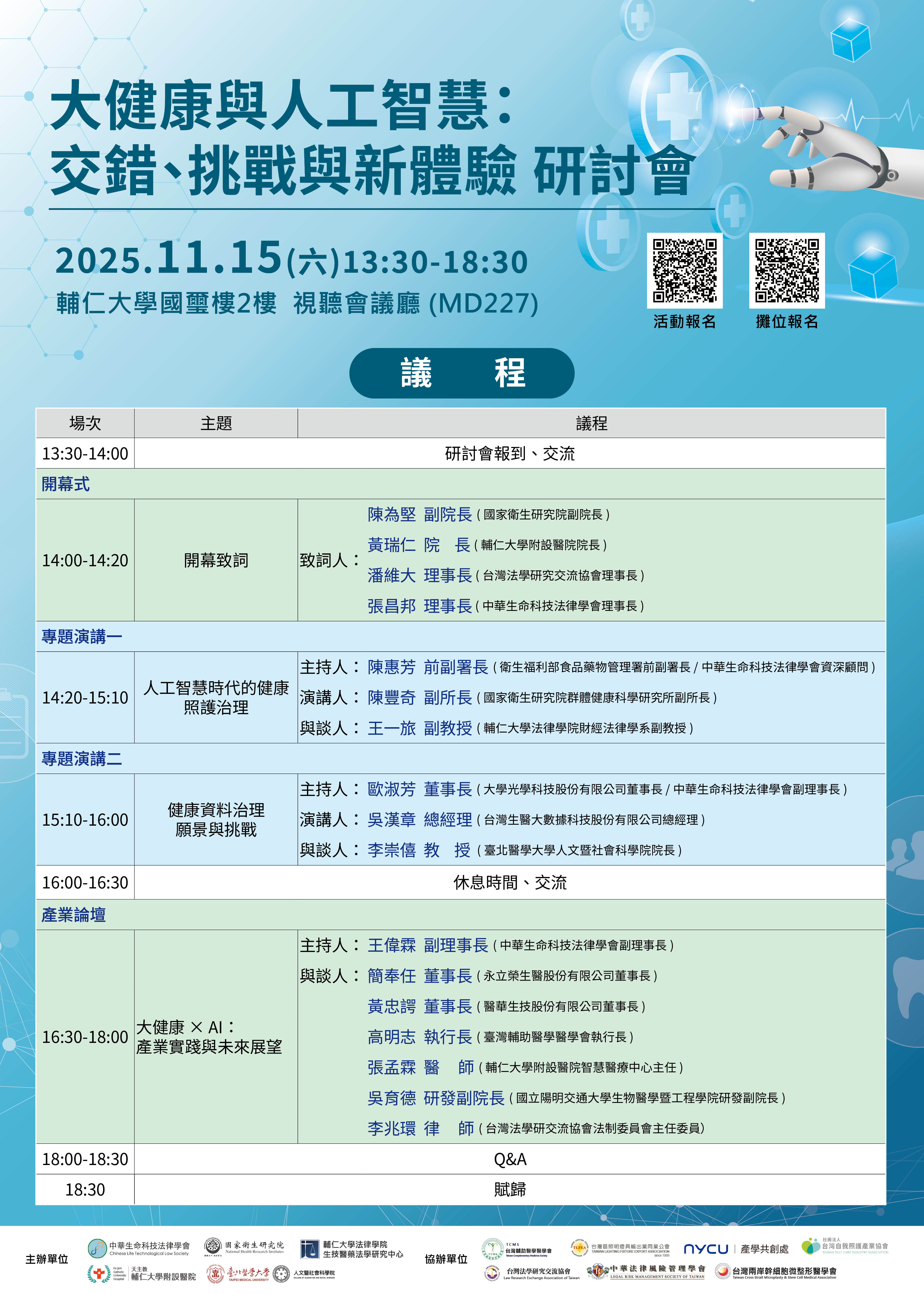 五、主辦單位:中華生命科技法律學會、國家衛生研究院、輔仁大學法律學院生技醫藥法學研究中心、輔仁大學附設醫院、臺北醫學大學人文暨社會科學院
