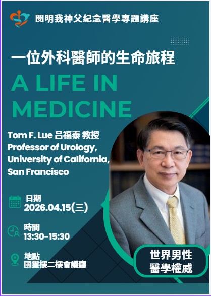 閔明我神父紀念醫學專題講座 時 間:115/4/15(三)13:30-15:30 地 點:國璽樓二樓會議廳 演 講 者: 呂福泰 教授 現職 舊金山加州大學(UCSF)泌尿科教授 Knuppe分子泌尿實驗室主任 主 題:一位外科醫師的命旅程 承辦單位:輔仁大學醫學院